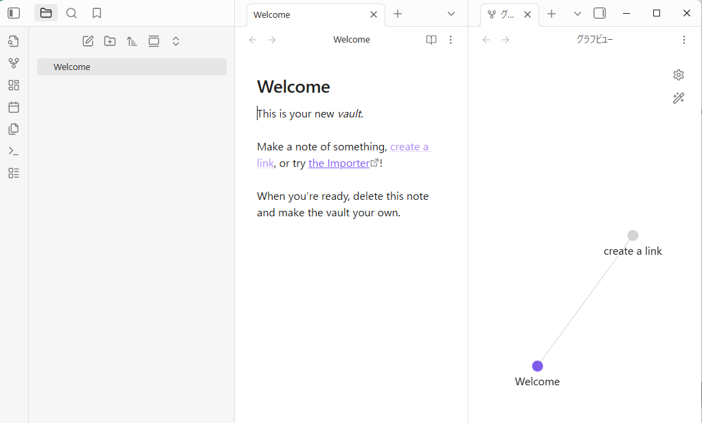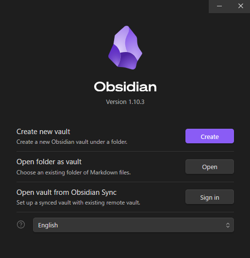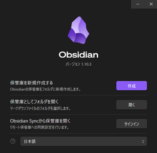 Obsidianを始めて起動すると、以下のような画面になるかと思います。