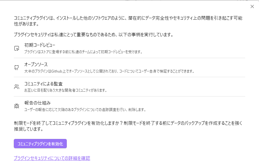 注意書きを十分読んだうえで、「コミュニティプラグインを有効化」をクリックしてください。