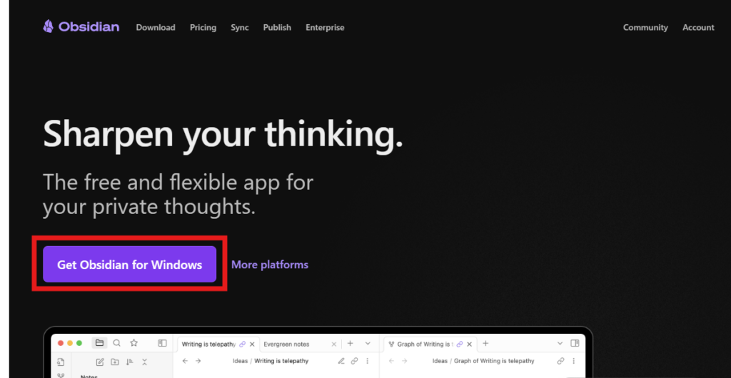 アクセスすると、以下のような画面になるので、赤枠で囲った「Get Obsidian for Windows」からインストーラーをダウンロードしてください。