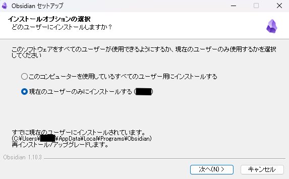 インストール先のユーザーを選択し、「次へ」をクリックします。(私は既にインストールされているので、下にその旨の記載があります)