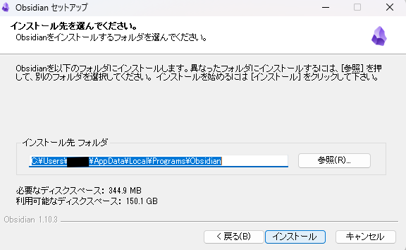 次にインストール先のフォルダを選択し、「インストール」をクリックします。こだわりがなければそのままで大丈夫です。